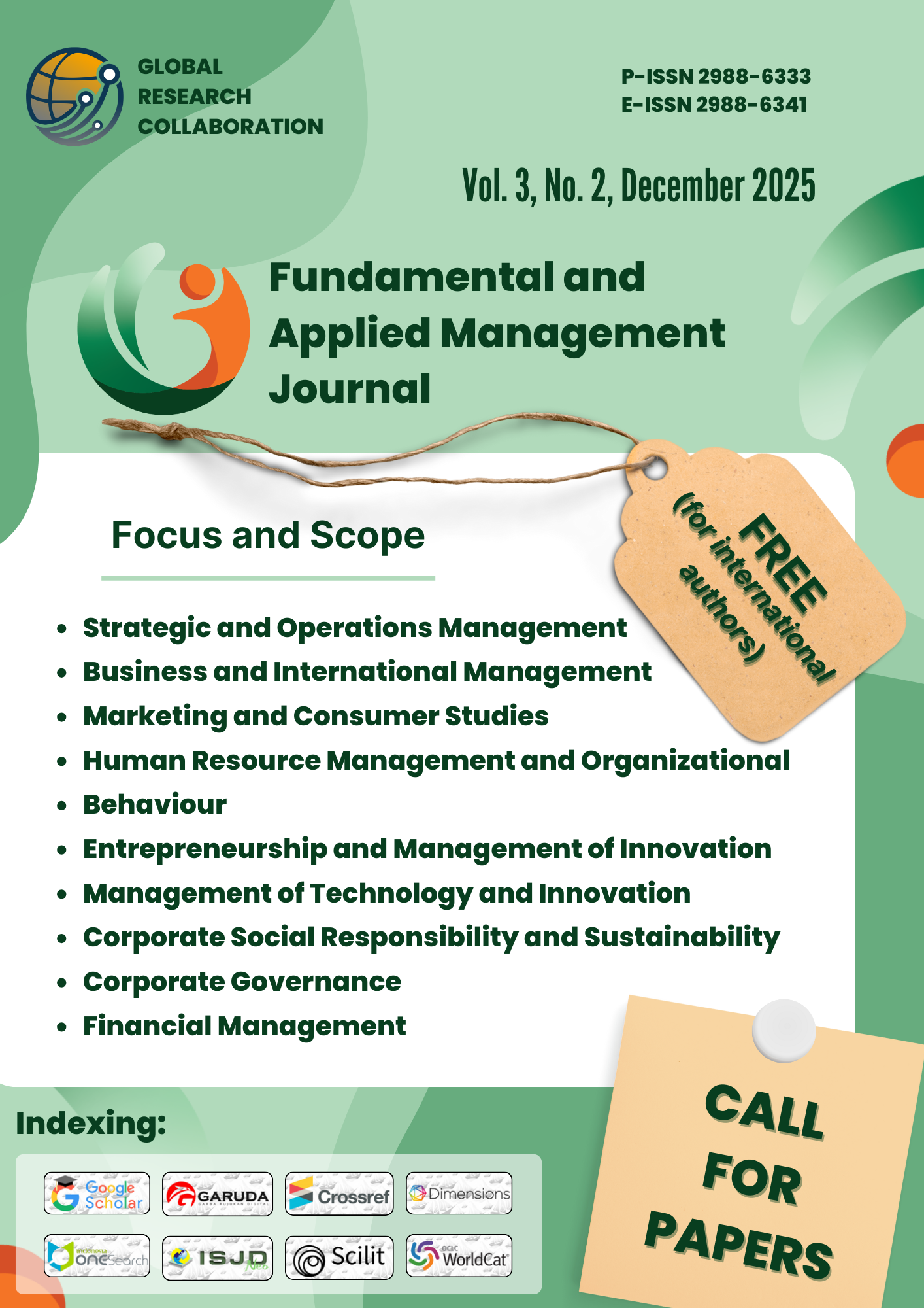 Fundamental and Applied Management Journal (FAMJ) publishes high-quality empirical research articles, conceptual papers, and review studies evaluated by experts through a rigorous double-blind peer-review process. Selected articles contribute new insights, strengthen theoretical foundations, and provide practical benefits for academics, industry professionals, policymakers, and the broader management community.